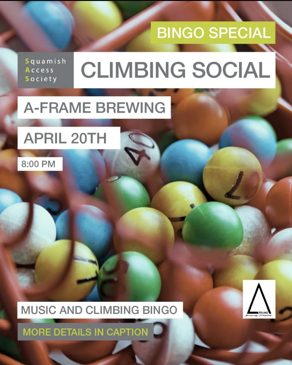 Thursday April 20th, we welcome community guest hosts from Squamish Access Society (SAS) for a fun social of Bingo! You don’t have to be an SAS member to play, so come and join the fun. First up is a round of Musical Bingo and then a second round of Climbing Route Trivia Bingo!