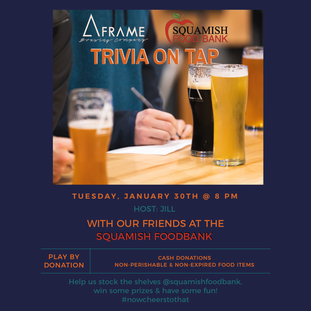 Our friends at Squamish Foodbank are coming out for Trivia On Tap tonight. Play by donating cash, or non-perishable and non expired food items. Let’s have some fun and stock their shelves while we are at.